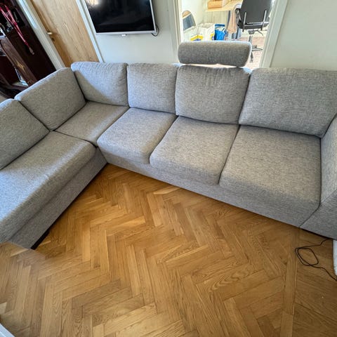 Säljer en modern och bekväm hörnsoffa i grått tyg som passar perfekt i både mindre och större vardagsrum. Soffan har en stilren design med raka linjer och är lätt att matcha med olika inredningsstilar.