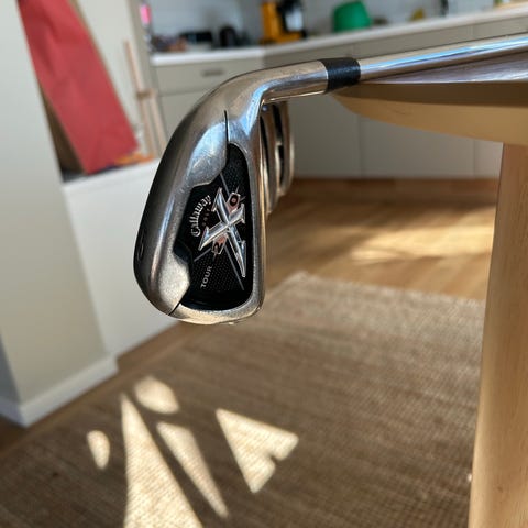 Järnset med golfklubbor i numren 4, 5, 6, 7, 8 9 och p . Klubborna har klubbhuvuden i metall och skaft i stål med svarta grepp. Setet passar som komplett järnuppsättning för spel på bana och träning på range. Skaftet ä Regular.