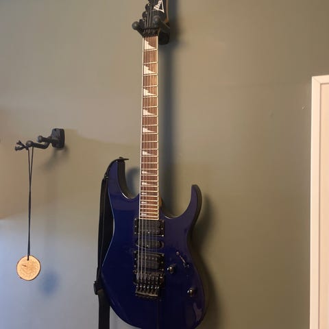 Gitarren har en blå kropp med mörkare mönster och två humbuckermikrofoner. Den har greppbräda med markerade inlägg och flera kontrollrattar för volym och ton. Passar för elförstärkt spel i olika musikstilar.
