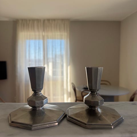 Ett par trearmade kandelabrar i tenn. De har rund fot och dekorativa detaljer i Art deco stil.