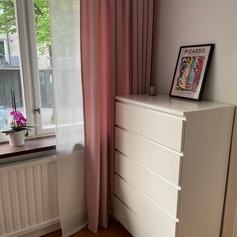 Ellos gardiner i rosa ton. Lätt, skir bomull som släpper igenom visst ljus.