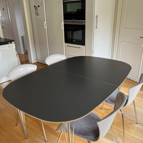 Matgrupp + 2 iläggskivor i mycket fint skick. 4 stolar grå/svarta som är svängbara. Inga märken på något.