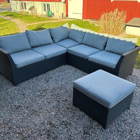 Hörngrupp för utebruk i brun konstrotting. Består av flera moduler som bildar en hörnsoffa samt ett rektangulärt bord med glasskiva. Passar exempelvis altan, uteplats eller inglasad balkong/uterum. Sitsar och ryggar är flätade i konstrotting, vilket ger ett enhetligt utseende och är anpassat för utomhusmiljöer. Bordet har ben i samma material som soffan och en plan glasskiva ovanpå för stabil avställningsyta.