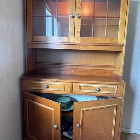 Skänk med spegel i vitmålat trä. Möbeln har överdel med hylla och oval spegel. Hylla med spegel sitter löst på utan fäste. Under finns en rymlig bänkskiva, två lådor upptill och dubbeldörrar nertill som döljer hyllplan i trä. Nyckel saknas.