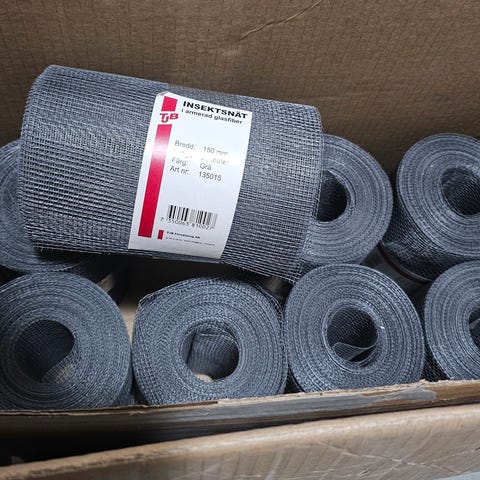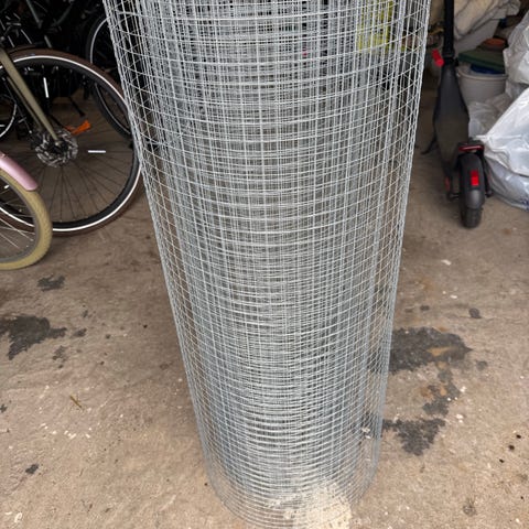 Två halvrullar stängselnät, spännlina och diverse monteringsmtrl som blivit över.