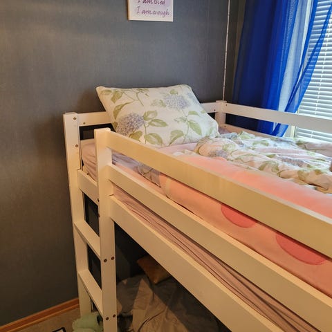 Loftsäng för barn i vit färg. Köpt på Mio. Sängen har stege på sidan och en upphöjd liggyta med skyddskant runtom. Utrymmet under sängen kan användas som lekhörna eller förvaring. Passar i barnrum där man vill utnyttja golvytan effektivt. Madrass och led-slinga ingår.