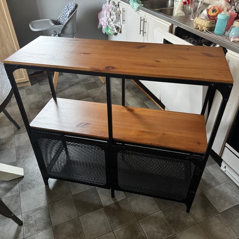 IKEA tv-bänk i kombination av brun träskiva och svart metallstomme. Bänken har öppna hyllplan i trä för förvaring av tv-utrustning samt två sidodörrar i svart metallnät. Passar som tv-möbel eller mediabänk i vardagsrum och liknande utrymmen.