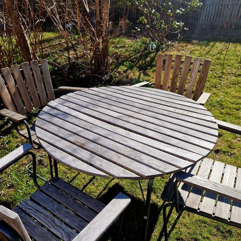 Matgrupp för uteplats bestående av rektangulärt bord och flera stolar. Bordsskivan är i trä med ribbad yta och benen är i metall. Stolarna har metallstomme, armstöd i trä och sits/rygg i textilmaterial med trä längst upp. Passar för användning på altan, balkong eller trädgård som sittgrupp för måltider och samvaro utomhus. Bordets mått L 150 cm B 90 cm H 75 cm. Fyra stycken positionsstolar med löstagbara dynor. Finns även två extra stycken positionsstolar utan trädetaljer men med likadana dynor. Så totalt sex stolar. Paketpris för allt 3000 sek. Bara att starta grillen.
