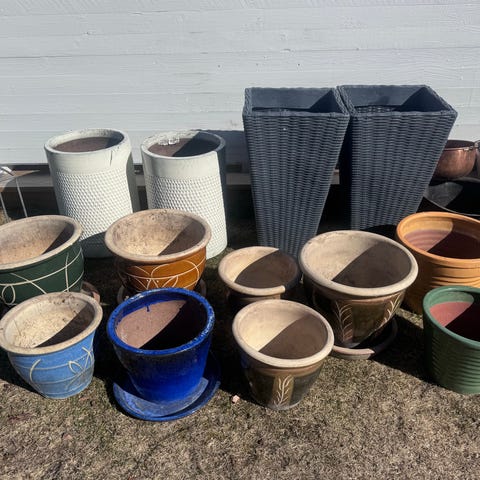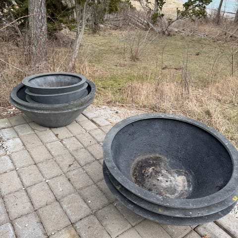 Set med runda blomkrukor i olika storlekar. Krukorna är mörkblå på utsidan och naturfärgade på insidan. Materialet liknar terrakotta eller keramik och varje kruka har dräneringshål i botten. Passar för plantering av blommor och växter utomhus. Vi har haft dem lite nedgrävda i rabatt för att markera gräns mellan olika blomsteruppsättningar.