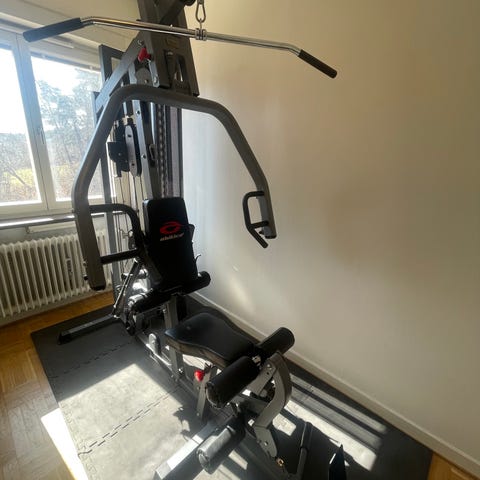 Multigym träningsstation i svart färg. Utrustad med viktmagasin och vajersystem för olika styrkeövningar för över- och underkropp. Justerbar sittdel och ryggstöd samt arm- och benstöd för exempelvis bröstpress, rodd, benspark och magövningar. Avsedd för inomhusbruk i hemmagym eller liknande miljö.