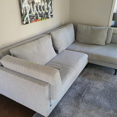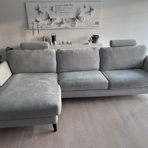 3m bred, 85cm djup. Schäslong med 2m. Grå klädsel . Inköpt för 3 år sedan, säljes pga flytt.