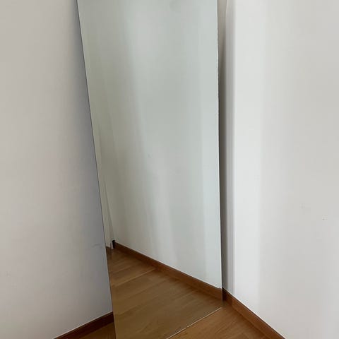 IKEA spegel med träram i brun färg. Rektangulär helkroppsmodell som kan placeras mot vägg eller monteras beroende på önskemål. Passar i hall, sovrum eller klädkammare för helkroppsspegling och inredning.