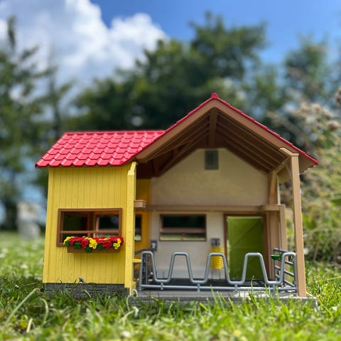 BRIO leksaksgård med ladugård och gårdsplan. Gården består av en byggnad med rött tak och tryckt fasad, öppen gårdsplan med grön botten och vit stengång samt ett öppet uthus/sidobyggnad. Runt gården finns ett staket. Lämplig som lekset för djur- eller bondgårdstema och kan kombineras med andra BRIO-figurer och tillbehör som säljs separat.