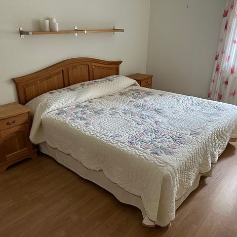 IKEA säng med madrass. Sängen har en vadderad bäddmadrass ovanpå resårmadrasserna. Passar som dubbelsäng i sovrum. Träram och sänggavel medförvaringsmöbler på sidorna syns på bilden, men huvudfokus är säng och madrass från IKEA. Sängramen går också att köpa men den är nedmonterad.