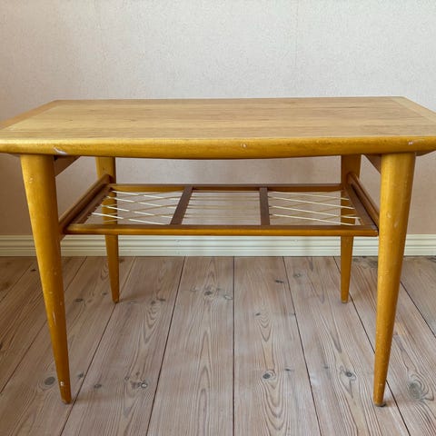Soffbord i björk och lind. Trevligt bord med en löstagbar bricka på hyllan under bordsskivan.