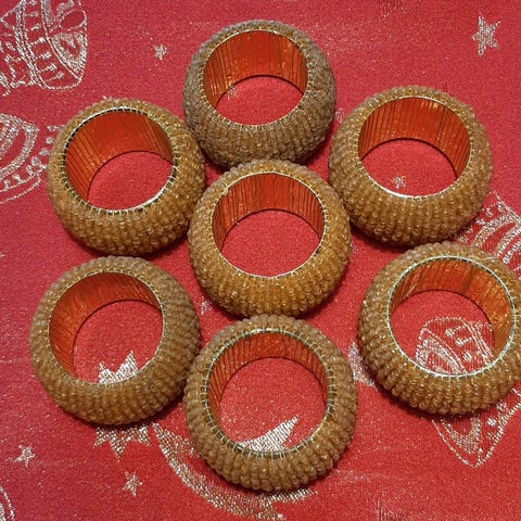 Liten rund och oval medaljong/berlock i kopparfärgad metall. Motiven föreställer bland annat en sittande figur och ett kärl med låga. Berlockerna har ögla upptill för upphängning i kedja, armband eller nyckelring. Storleken framgår av bilden med linjal som referens.
