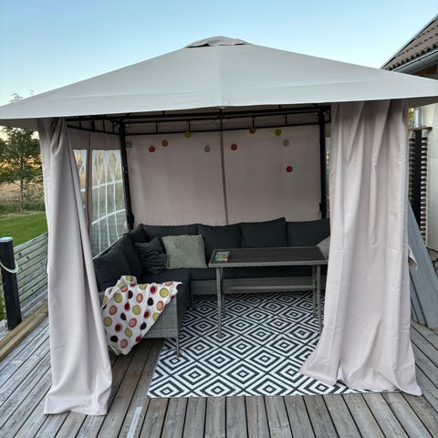 Dagbädd med tak för utomhusbruk i grå färg. Stabil ram med fyrkantiga stolpar och tygskydd/tak i textil som ger skugga. Stor liggyta med tjock madrass och lösa kuddar i matchande grått tyg. Passar för placering på altan, uteplats eller i trädgård som loungemöbel eller solbädd.