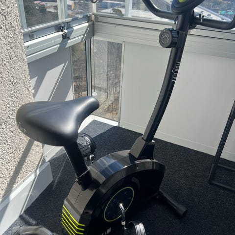 Monark motionscykel i vit och blå färg. Utrustad med justerbart styre och sadel för att kunna anpassas efter användarens längd. Pedaler med remmar ger stabilitet vid träning. Lämplig för inomhusträning och konditionsträning i hemmet! Stabil med lågt insteg.