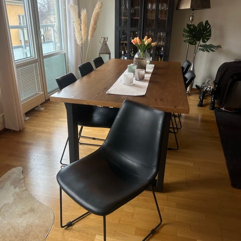 6st matstolar SM58 Skovby i svart läder och ben i borstat stål. En modern stol med en skönt rundad rygg som utstrålar elegans och klass. Dom är i så gott som nyskick.