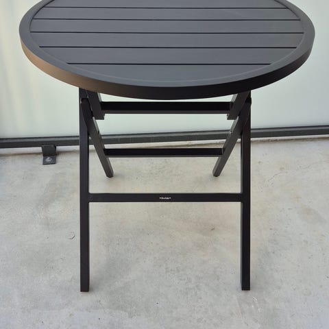 Hopfällbart sidobord i svart färg. Bordet har ribbad bordsskiva och kryssben som kan fällas ihop för enkel förvaring. Passar som litet avlastningsbord inomhus eller utomhus på balkong, altan eller uteplats. Mått 43x45 höjd 50cm