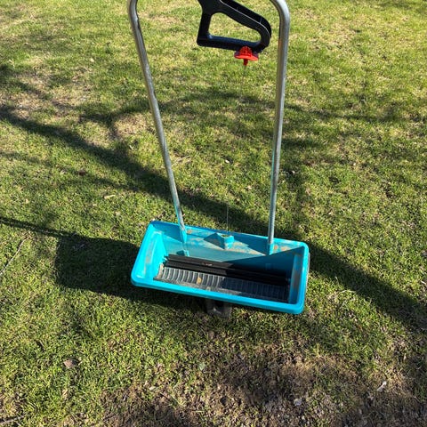 Gardena spridare för gödsel och frö i blå plast med två hjul och handtag. Lämplig för spridning av gödsel, frö eller sand på gräsmatta och andra ytor. Justerbar öppning för dosering och jämn fördelning av material vid gång bakom spridaren.