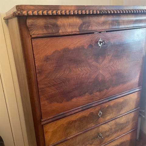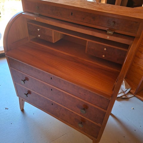 Detta är den perfekta möbeln för dig som vill kombinera praktisk förvaring med en elegant arbetsplats. När skrivklaffen fälls ner avslöjas en charmig inredning med flera små lådor och fack – perfekt för papper, brev och småsaker.