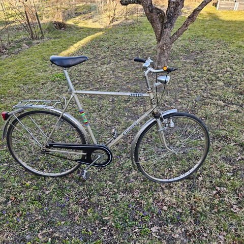 Snygg orange lack med tre fungerande växlar och en säker fotbroms. Snygga detaljer och utrustad med pakethållare och reflexer. Även påkostad med en ny kedja för 100 kr så den har många mil kvar denna fincykel!