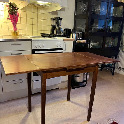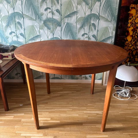 Snyggt och tidlöst cafébord med skiva i teak och stabilt, svartlackerat metallunderrede. Perfekt som frukostbord i det mindre köket eller som en snygg inredningsdetalj i vardagsrummet. Bordet har en klassisk skandinavisk retrokänsla.