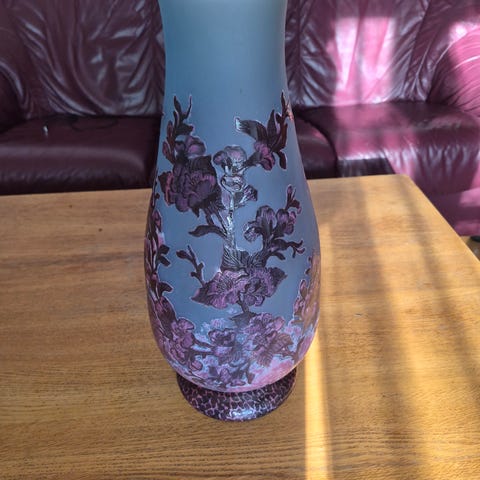 Säljer en mycket dekorativ och handgjord vas i kaméglas med ett vackert blommönster i gröna och vita toner. Den här vasen har en fin historia då den tillhörde min morfar fram till 80-talet då han gav den vidare till min pappa.