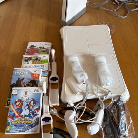 Nintendo Wii spelkonsol med handkontroller, kablar, sensorbar och olika spel, däribland tränings- och dansspel samt partyspel. Passar för en eller flera spelare beroende på spel och antal kontroller. Exakt antal tillbehör och titlar på spel framgår av bilden.
