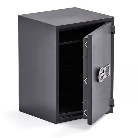 Enligt märkplåt är skåpet testat enligt BS476 Part 20 med 60 minuters klassning samt standard LPS 1183:4, grade 0. Skåpet är certifierat av Stöldskyddsföreningen (SSF) och tillverkat av Rosengrens Produktions AB i EU. Passar för användning i exempelvis hem, kontor eller mindre verksamheter där man vill förvara värdesaker och viktiga handlingar mer skyddat. Mkt hög kvalitet även för brand.