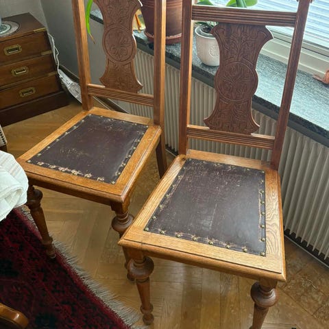 Stolarna är stabila och bekväma att sitta på. Normalt bruksskick med visst färgslitage och mindre märken (se bild), vilket också ger dem lite härlig patina. Perfekta till köksbordet, i sommarstugan eller som extra stolar när du får gäster.