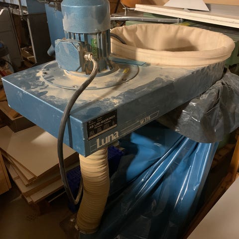 Spånsug i grön färg med vit uppsamlingssäck. Maskinen består av motorenhet på golvstativ samt separat enhet med filter- och uppsamlingssäck. Avsedd för utsug av spån och damm vid exempelvis träbearbetningsmaskiner i verkstad eller hobbyverkstad. Anslutning sker via slang till maskinernas utsug.