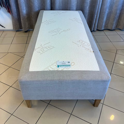 Carpe Diem Beds säng med bäddmadrass i ljusgrått tyg. Sängen har en vadderad bäddmadrass med knapptuftad ovansida. Mått 90 cm bred, 200 cm lång. Fläckar på bäddmadrass. Mycket skön.
