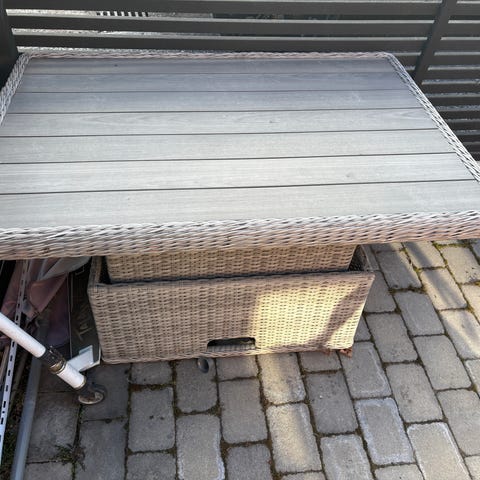 Rektangulärt trädgårdsbord med bordsskiva i trä och ben i metall, fällbart, 114x 70cm och 65cm högt.