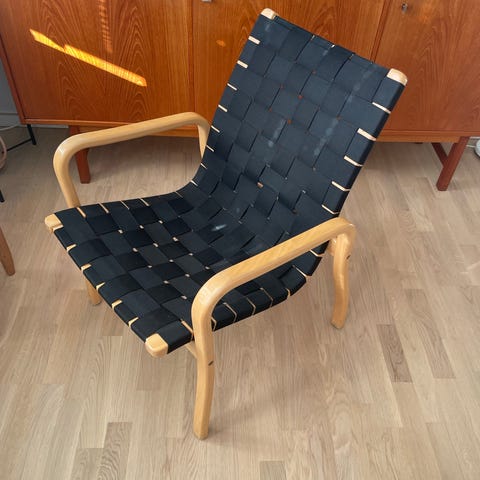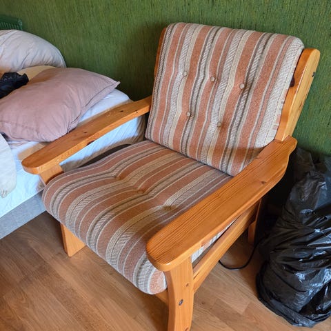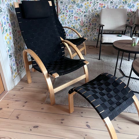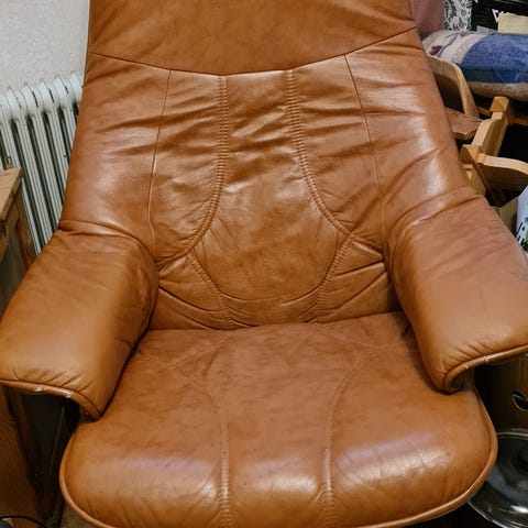 Två fåtöljer med en fotpall i grå sadelgjord bortskänkes.