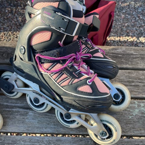 SOC inlines/rullskridskor för barn i storlek 35-38. Modellen har hårt yttre skal i svart med rosa och turkosa detaljer samt vadderad innersko i rosa. Utrustade med fyra hjul per skridsko i flera färger och justerbara spännen samt kardborreband för att ge stabil passform runt fot och fotled.