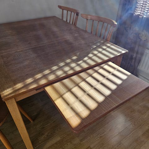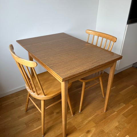 Matbord med utdragbara iläggsskivor, i mycket gott skick (nästan nytt) inklusive tre stolar och sittdynor.