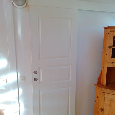 Skjutdörr för inomhusbruk i vit färg. Dörren är monterad i en skena ovanför dörröppningen och skjuts längs väggen. Passar som rumsavdelare eller dörr till exempelvis sovrum, hall eller förråd där man vill spara golvyta jämfört med en traditionell slagdörr.