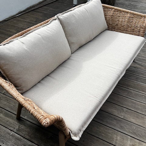 Jag köpte den så sent som den 13 mars 2026 och har precis monterat ihop den, men insåg tyvärr efteråt att hela möbelgruppen blev för stor för min balkong. Fåtöljen är därför helt oanvänd och i absolut nyskick.