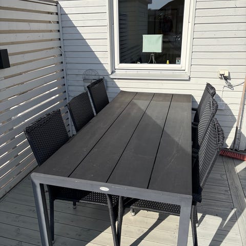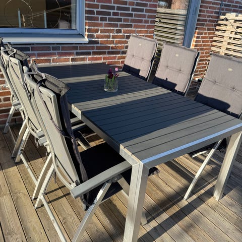 Matgrupp för utomhusbruk bestående av ett rektangulärt bord med måtten L:200cm, B:100cm och H:74cm, sex st positionsstolar med dynor .