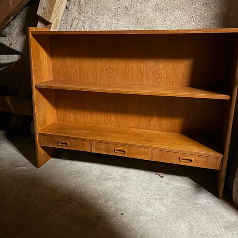 Byrå med 3 lådor tillverkad i Sverige på 1950- och 60-talen. Den är gjord av massivt trä på benen och av teakfaner på ovansidan och stommen.