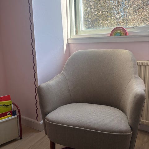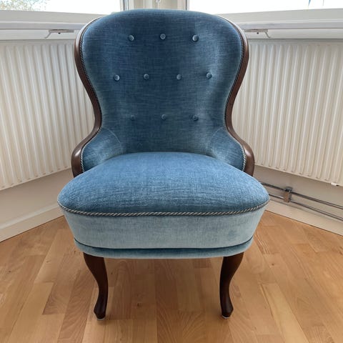 Klädseln visar tydligt slitage och är i behov av omklädsel. Lämplig som sittmöbel i vardagsrum eller läshörna, alternativt som renoveringsobjekt för den som vill bevara originaldesignen.