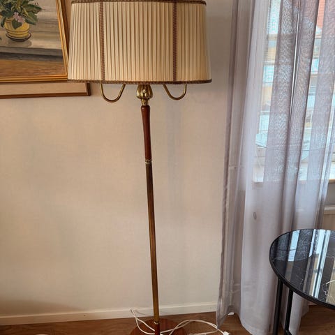 Mässing/guld färgad metall troligen 70-tal. Nyare skärm, enkel att byta.