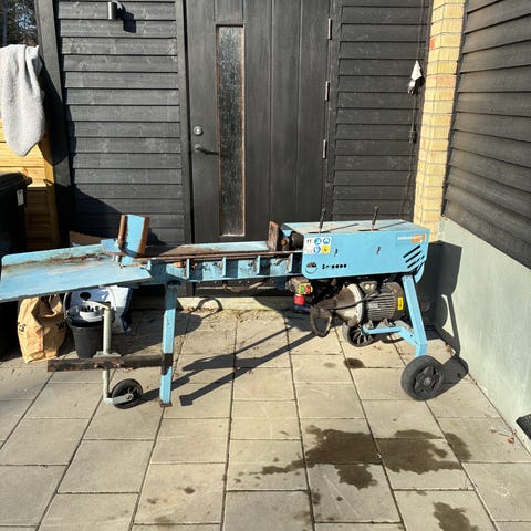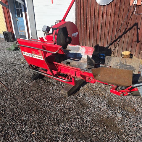 Traktordriven vedmaskin.