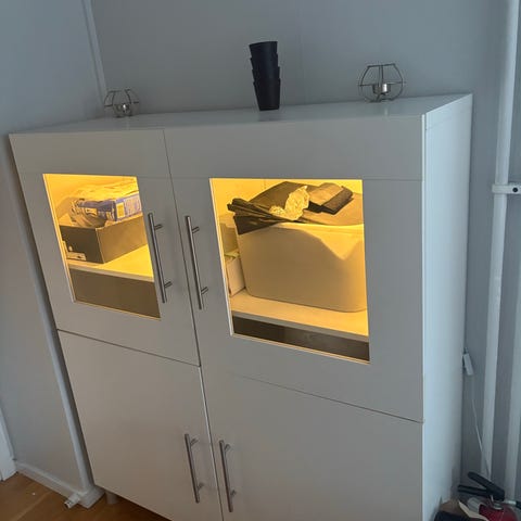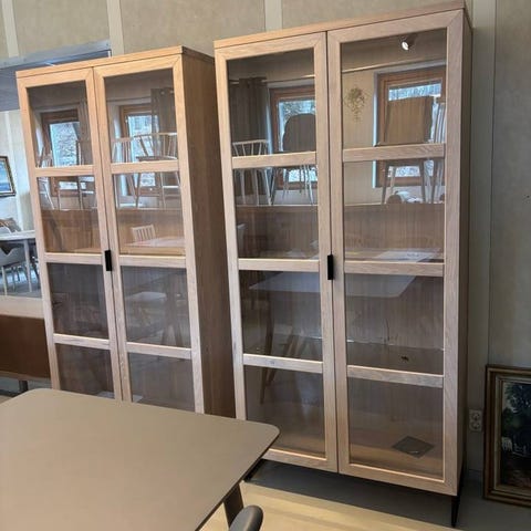 Vitrinskåp i vitpigmenterad ekfaner från AC Design Furniture, modell Algot. Två glasdörrar och en låda.