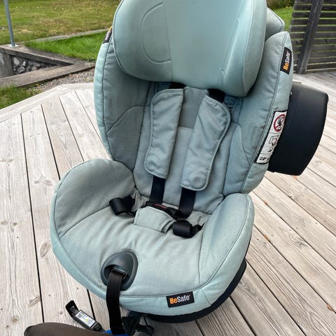 BeSafe iZi Modular bilstol + ISOfix-bas. Bilbarnstolen är turkos med svart bas och har sidokrockskydd och stöd för huvud och kropp. Passar för barn inom storleksgrupp 25 enligt tillverkarens rekommendationer. Sätet används bakåtvänt enligt standard för bilbarnstolar i denna