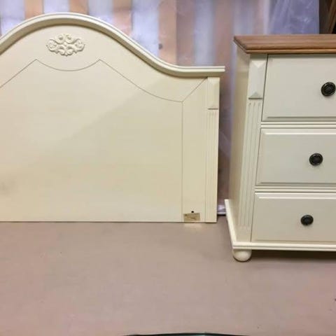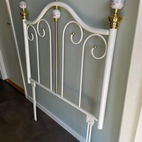 Sänggavel i mässing, Ikea Malm, Vikbart bord + 2 stolar