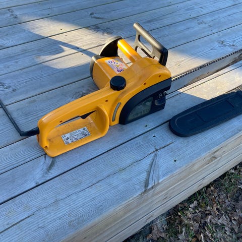 Stiga motorsåg i gul färg med svärd och kedja. Sågen är bensindriven och har främre och bakre handtag för tvåhandsfattning samt kedjeskydd. Passar för kapning av ved och enklare trädfällning i trädgård eller skog. Modellbeteckning och exakta tekniska data framgår av märkning på sågen och svärdet.