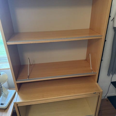Kinnarps skrivbord med höj- och sänkbar funktion. Bordsskiva i ljust träutförande med kabelgenomföring. Svarta benstativ i metall. Dokumentskåp i samma träutförande med öppna hyllplan. Lämpligt som arbetsbord eller kontorsbord i hemmakontor eller på arbetsplats.